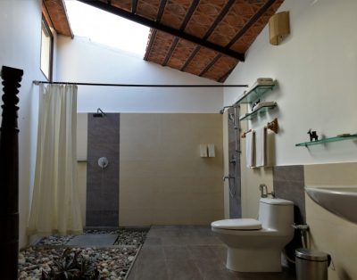 The bungalow has two bedrooms on the first floor with attached bathrooms. Encircling them are large lounging and living areas with single beds and settees to accommodate more people. On the ground floor are two more bedrooms with attached bathrooms.